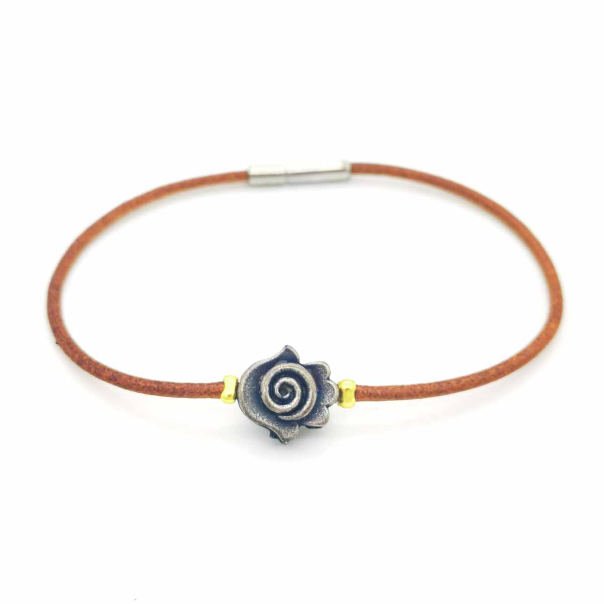L'association délicate du cuir et de l'Etain, renvoie l'image d'un bijou raffiné. Ce Bracelet de cuir brun naturel et son Tourbillon dans une Main d'Etain a une fermeture magnétique.