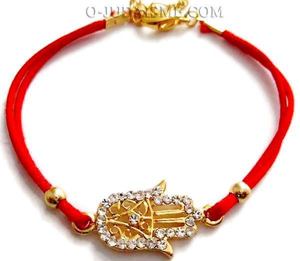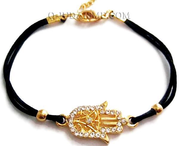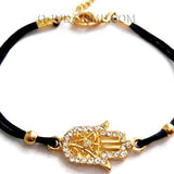 It is a very pretty "Hand of Myriam" silk thread bracelet that we offer. A hamsa medallion encrusted with CZ stones embellishes this very trendy jewel.