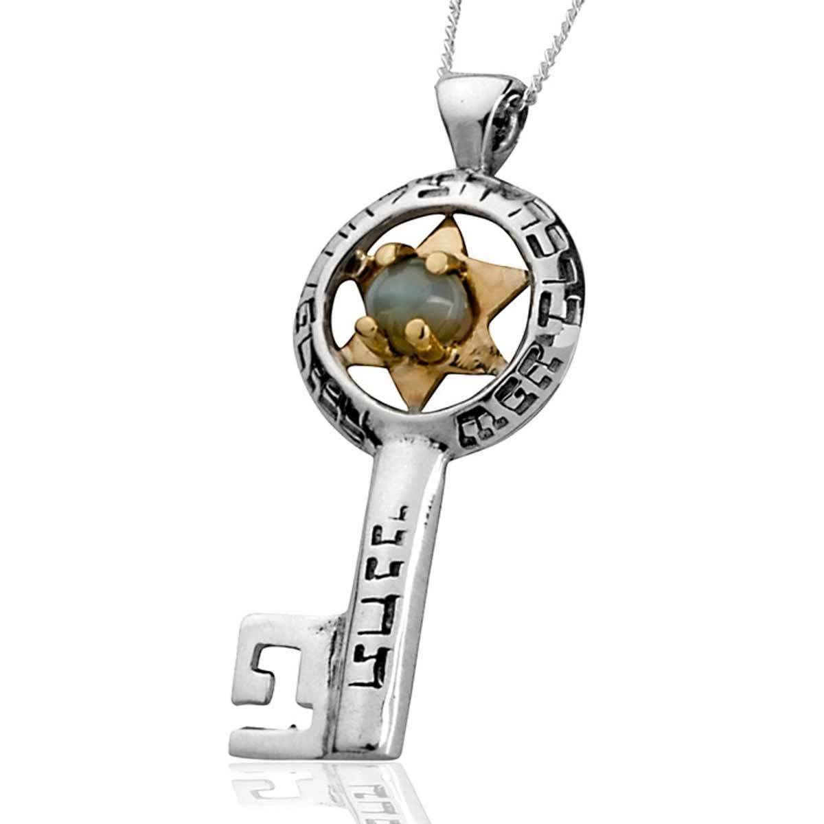 This key is sterling silver. The upper part of the pendant is adorned with a gold Star of David with a Chrysoberyl (Cat's Eye) gem in its heart. On the upper part, a psalm is beautifully engraved: “Give me abundance, grace and success”.
