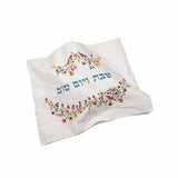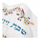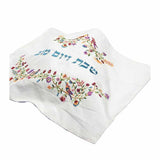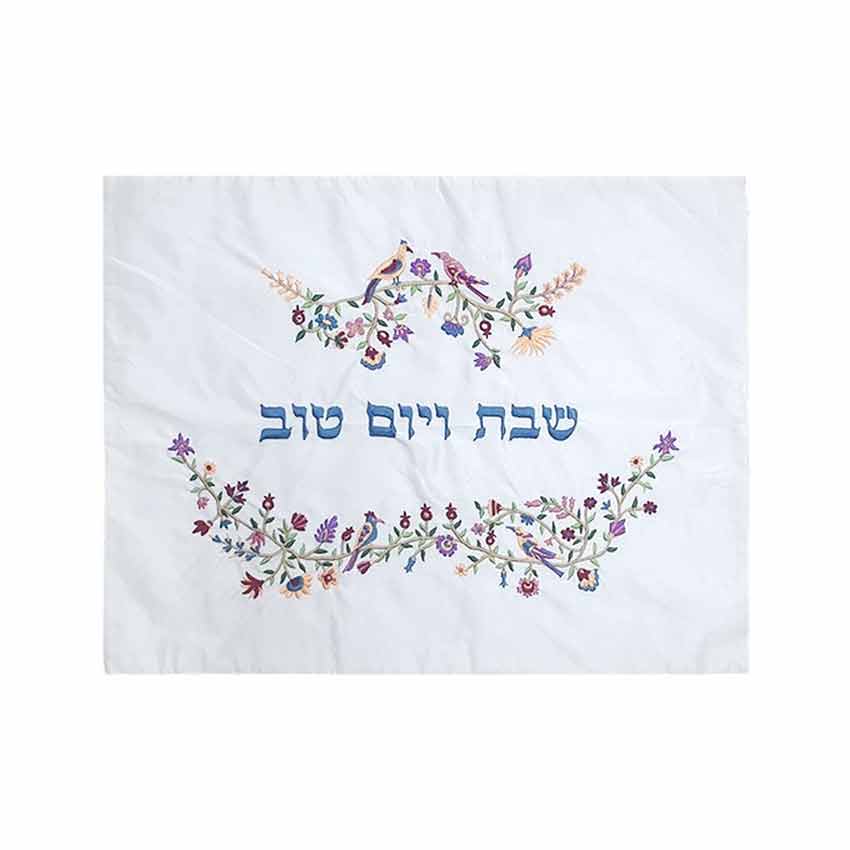 This Shabbat bread cover is decorated with a cheerful pattern of lions, birds and plants, encircling the words "Shabbat Ve Yom Tov" (Shabbat and holidays) embroidered in Hebrew.