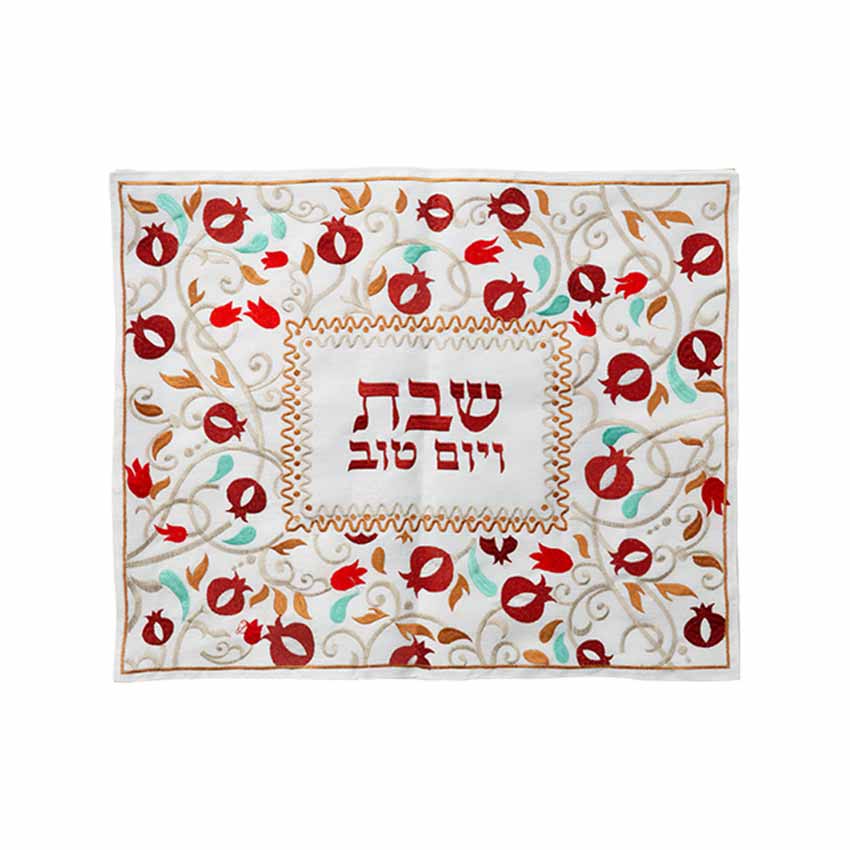 Ce couvre Pain du Chabbat est décoré de motifs représentant des grenades, symbole de l'abondance. Le tout entoure la broderie en lettre hébraïque du mot Shabbat Vé Yom Tov.