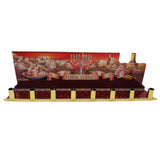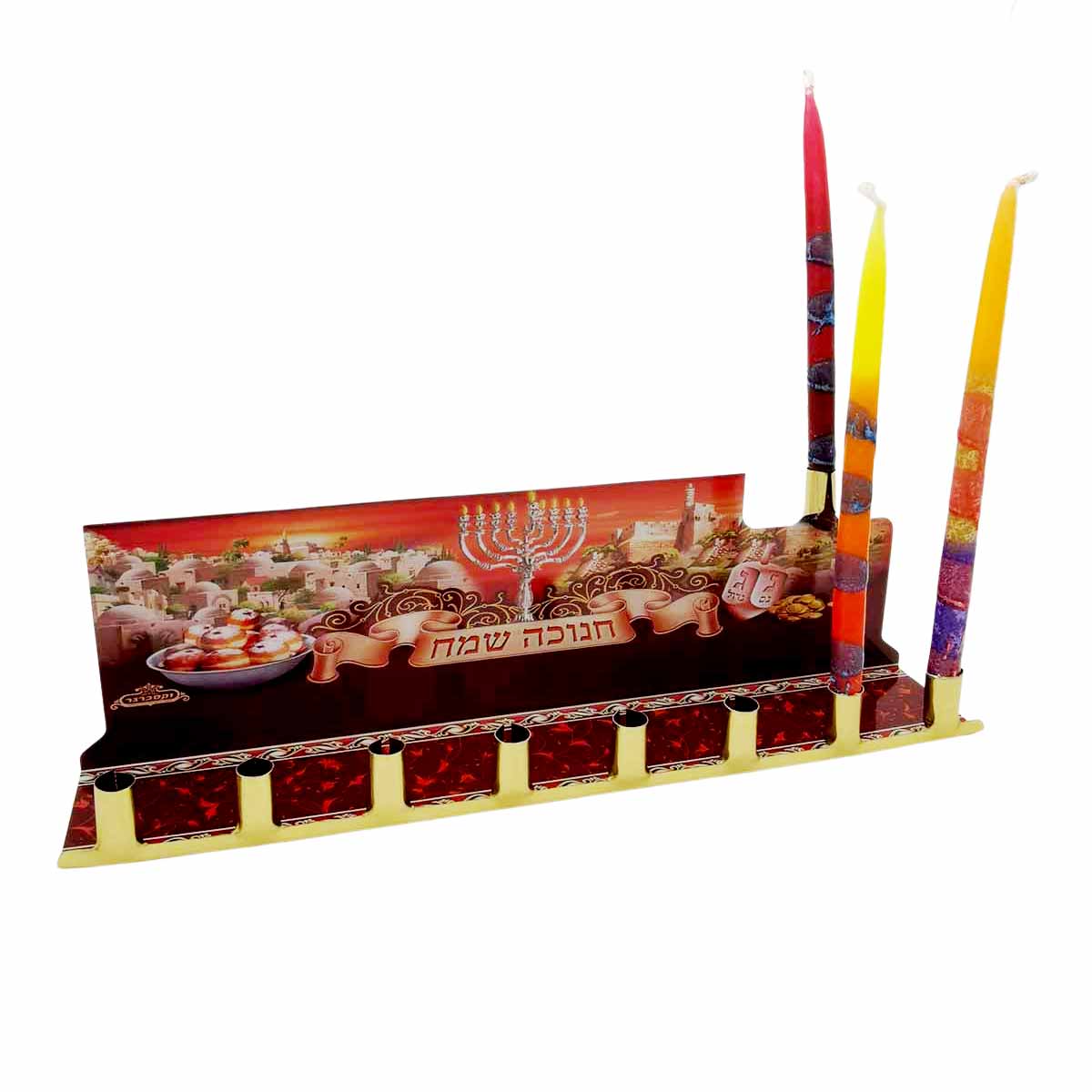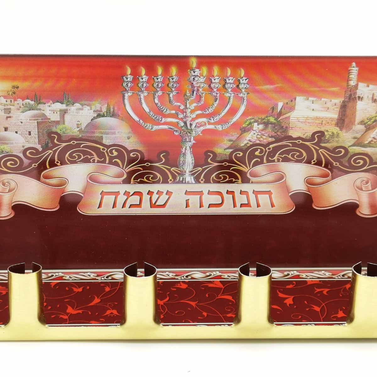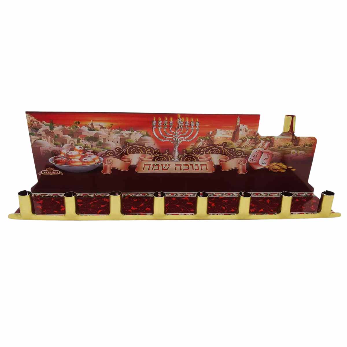 The words Hanukkah Sameah appear in Hebrew letters. They were written on the surface of the metal, above the eight candlesticks. The ninth candlestick, the Shamash, was placed above.