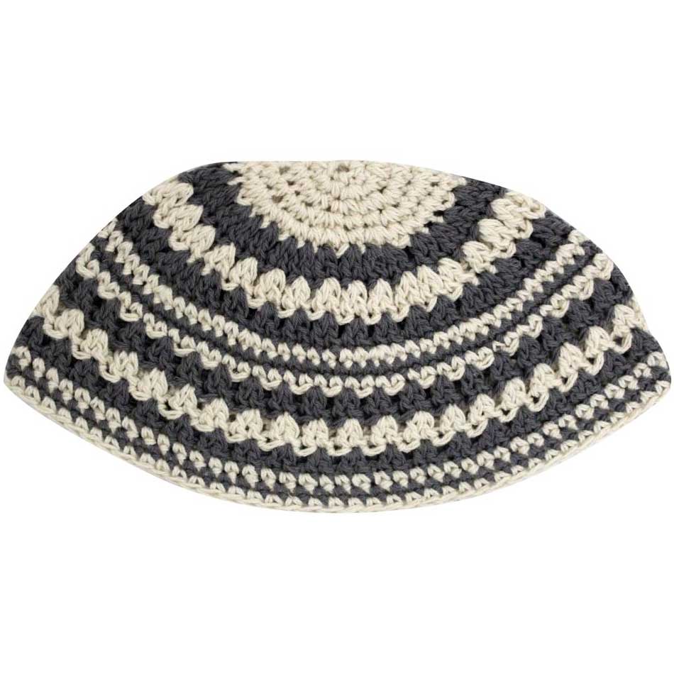 Nous vous proposons cette Kippa Enveloppante Grise et Crème de belle qualité faite entièrement au crochet, où se dessine des motifs en deux couleurs qui se marieront parfaitement avec tout vêtements.