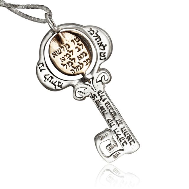 Three-dimensional pendant in the shape of a key , handmade in gold and silver . According to Kabbalistic sources, the key is a symbol of success and prosperity. The body is made of sterling silver, engraved with the prayer of TikunKlali allowing the redemption of sins. The top of the key is decorated with a rotating gold coin inscribed with one of Gd's 72 names "Samech-Aleph-Lamed" which will bring you abundance and wealth.