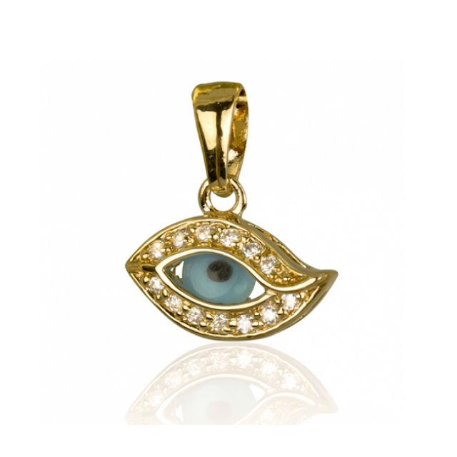 Beautiful gold-plated eye -shaped pendant adorned with small shiny zirconiums and a turquoise glass bead.