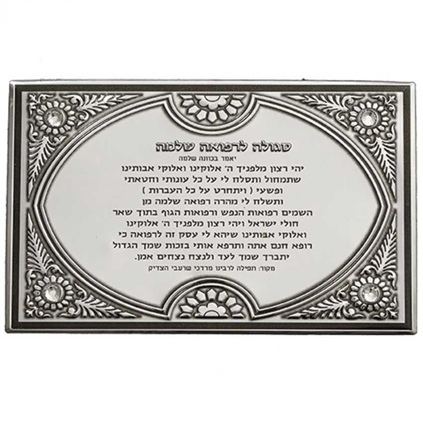 Silver in color, it is engraved in relief "Sgoula LéRéfoua Chéléma". She also sports four small white stones (shiny way) at the four corners of this blessing card.