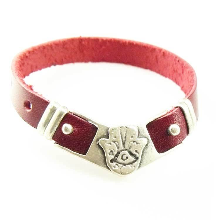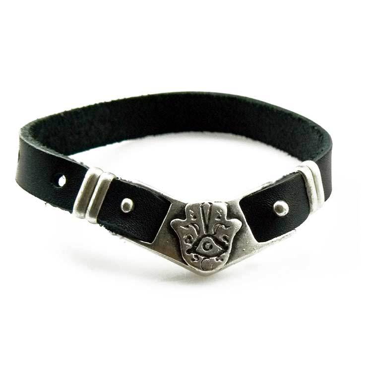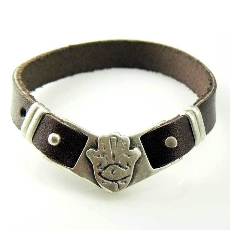 Brazalete de cuero adornado con una placa de plata envejecida donde están grabados en relieve un Hamsa y un Ojo .