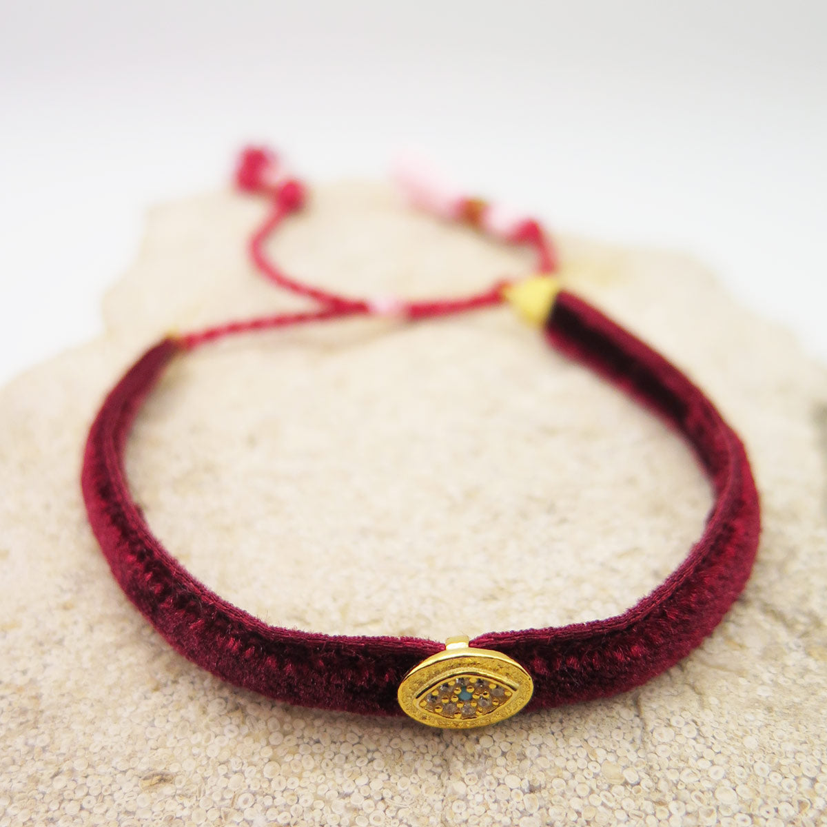 Esta Pulsera de Terciopelo y su Ojo engastado con pequeñas piedras Cz serán tu aliado contra el mal de ojo. Él se adapta a todas las muñecas gracias a su cordón ajustable.
