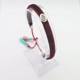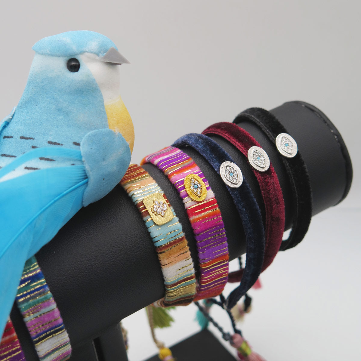 Puedes elegir, según tu preferencia, entre Chapado en Oro o Plata así como el color del terciopelo de tu pulsera. Para más fantasía, pequeños pompones añaden un toque de originalidad a esta bonita joya.