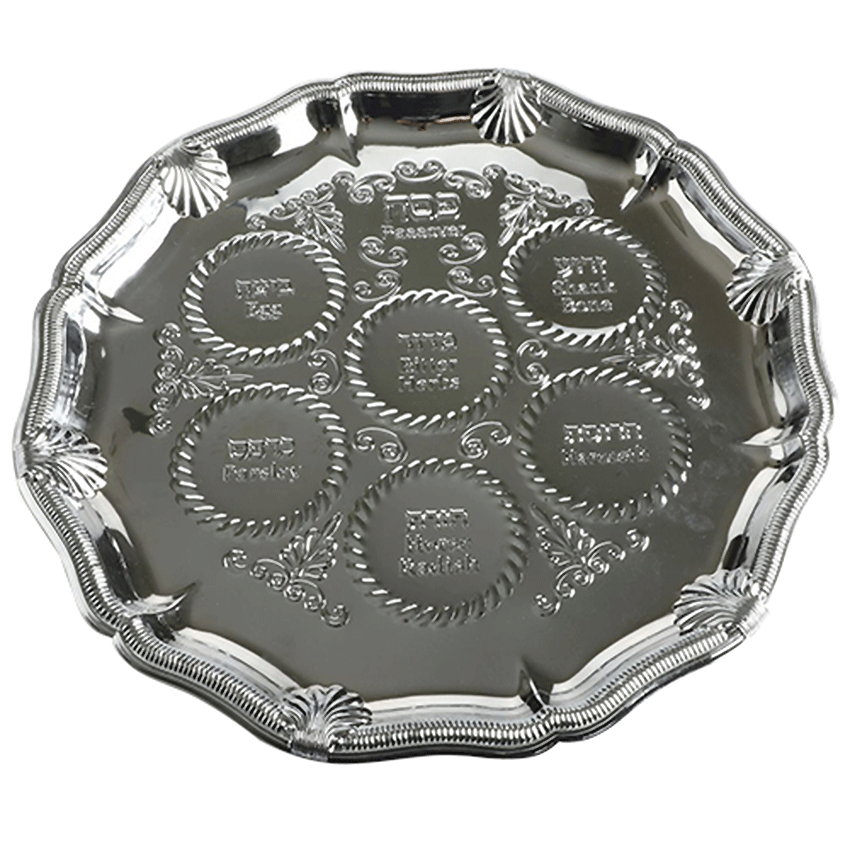 Esta bandeja de séder de metal plateado bellamente decorada se verá genial en la mesa de su fiesta.