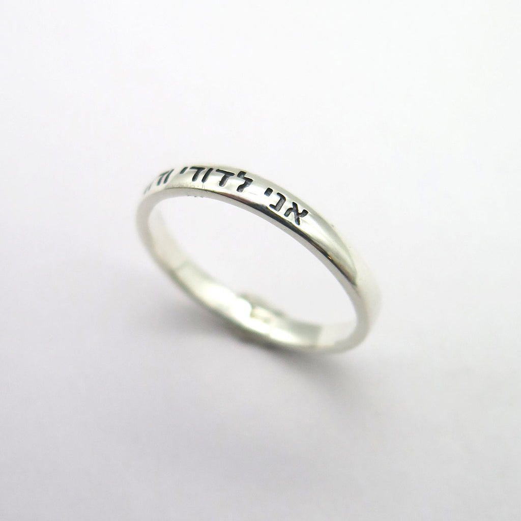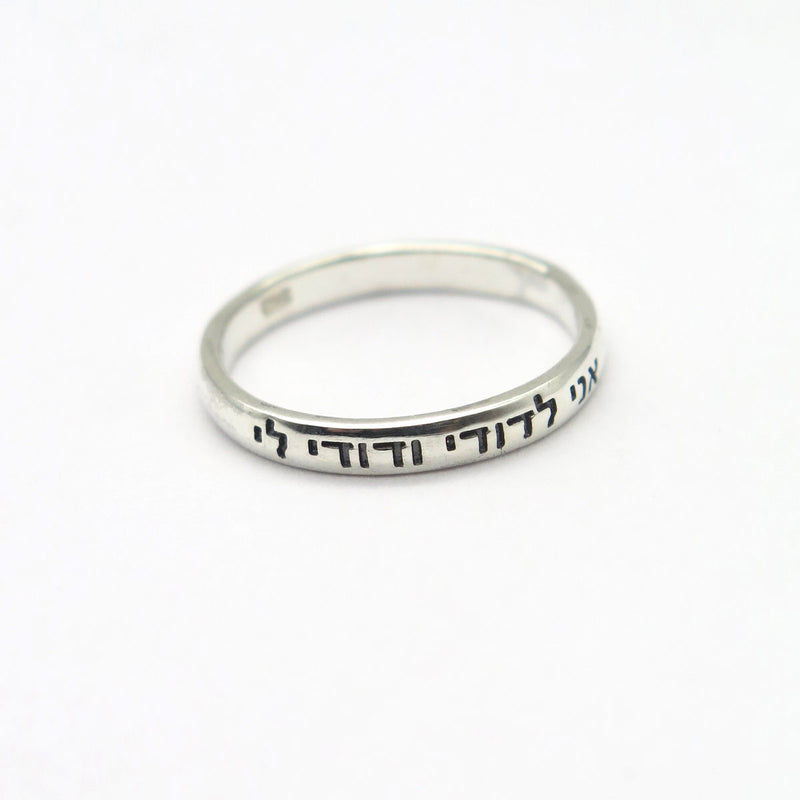 Cette magnifique bague de fiançailles en argent 925 Sterling pour un homme ou une femme arbore les mots hébraïques sur sa surface Ani le'dodi ve'dodi li signifiant "Mon Bien-aimé est à moi, et je suis à lui". L'un des versets les plus cités de la Bible Hébraïque est certainement cet extrait du Cantique des Cantiques (ou Cantique de Salomon).