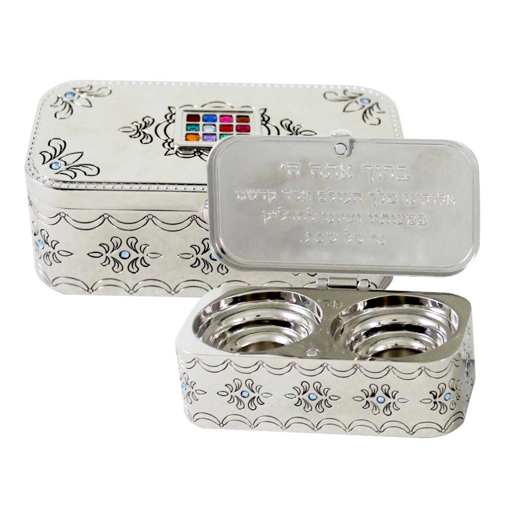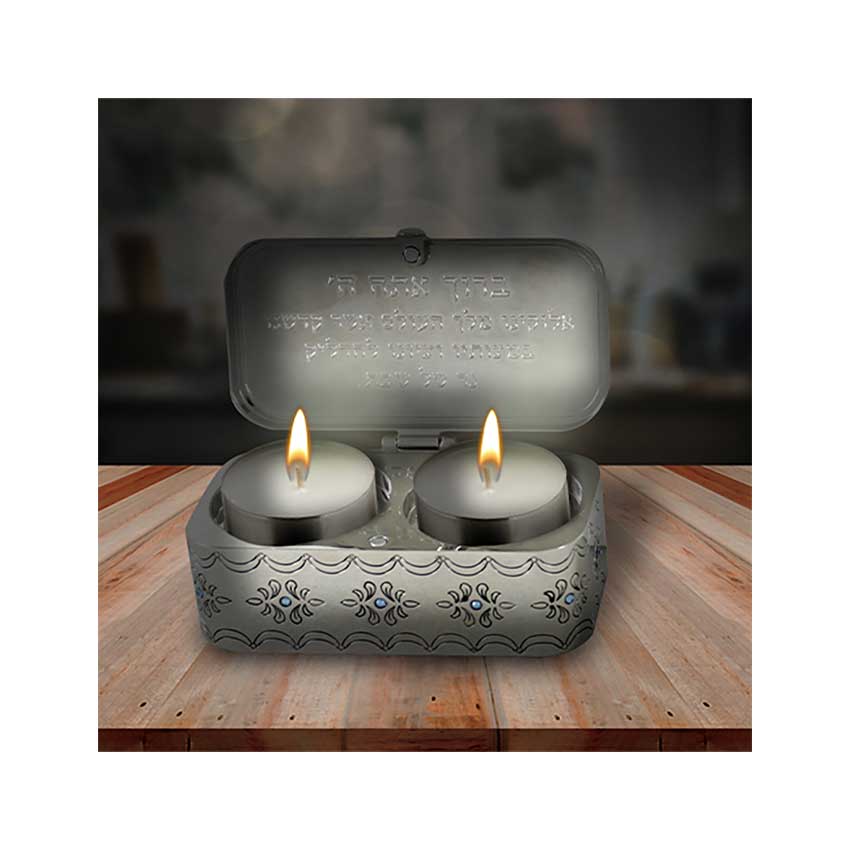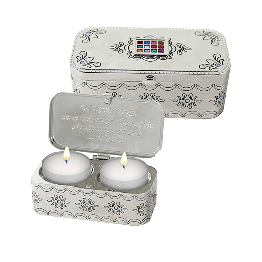 Sur ce bougeoirs les 12 Pierres représentant les 12 Tribus d'Israel, s'y inscrivent en perspective. Sur la face interne du couvercle, est inscrite la prière de l'allumage des bougies du Shabbat.