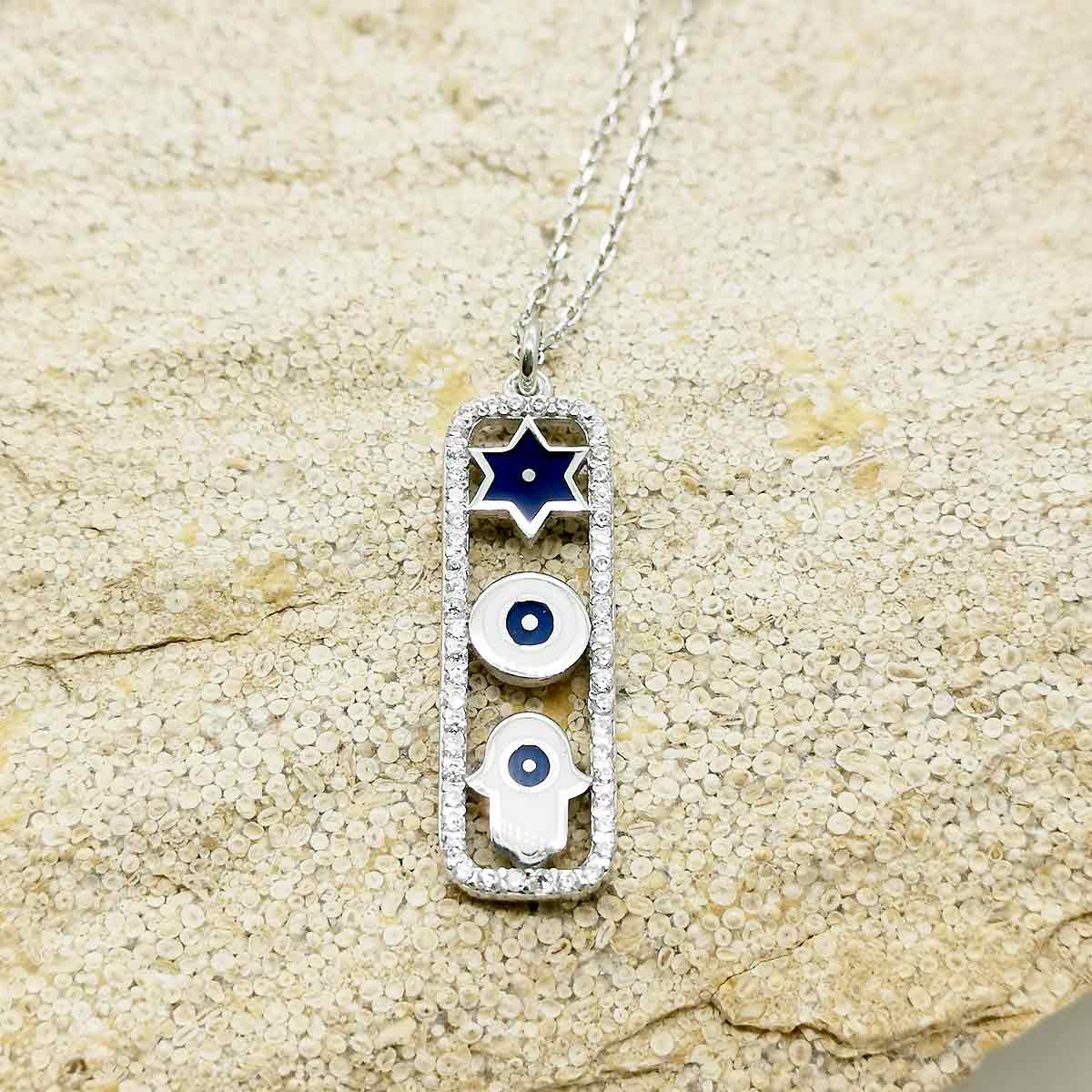 Ce beau Collier des signes protecteurs aux couleurs d'Israel en rhodium regroupe les 3 symboles protecteurs : L'Étoile de David, l'Oeil et une Main. Ce pendentif est livré avec sa chaînette de 45cm.