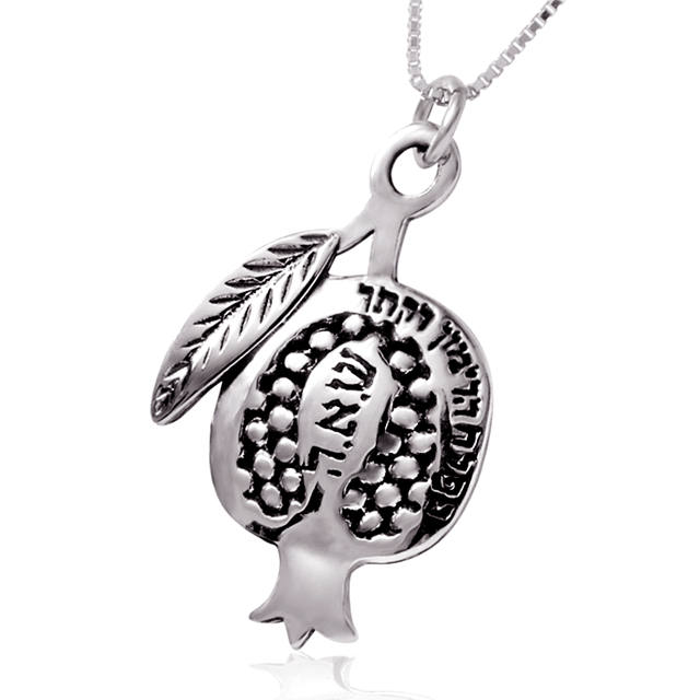 Magnifique collier de la Kabbale, représentant une grenade en argent 925 où se trouve une inscription hébraïque. Comme décrit dans la Bible, la grenade est l'une des sept espèces appartenant à la Terre Sainte. C'est un symbole d'abondance et de sagesse.