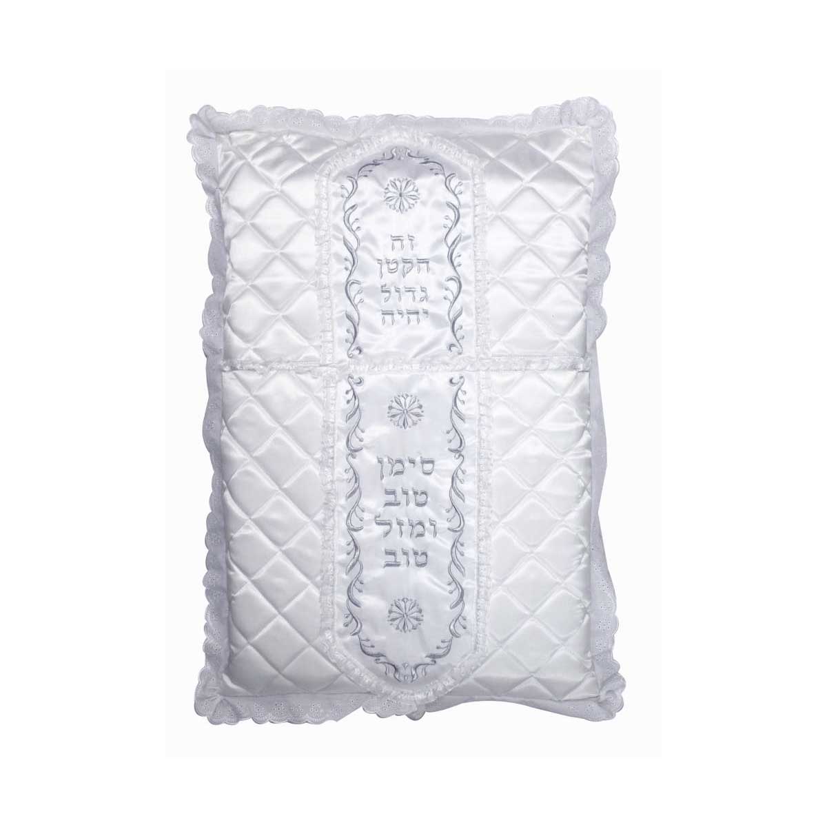Ce coussin de Brit mila est joliment entouré d’une broderie anglaise. Il est également brodé de la bénédiction pour les nouveaux nés.: Zé Hakatan, Gadol Ihiyé Simane Tov Vé Mazal Tov.
