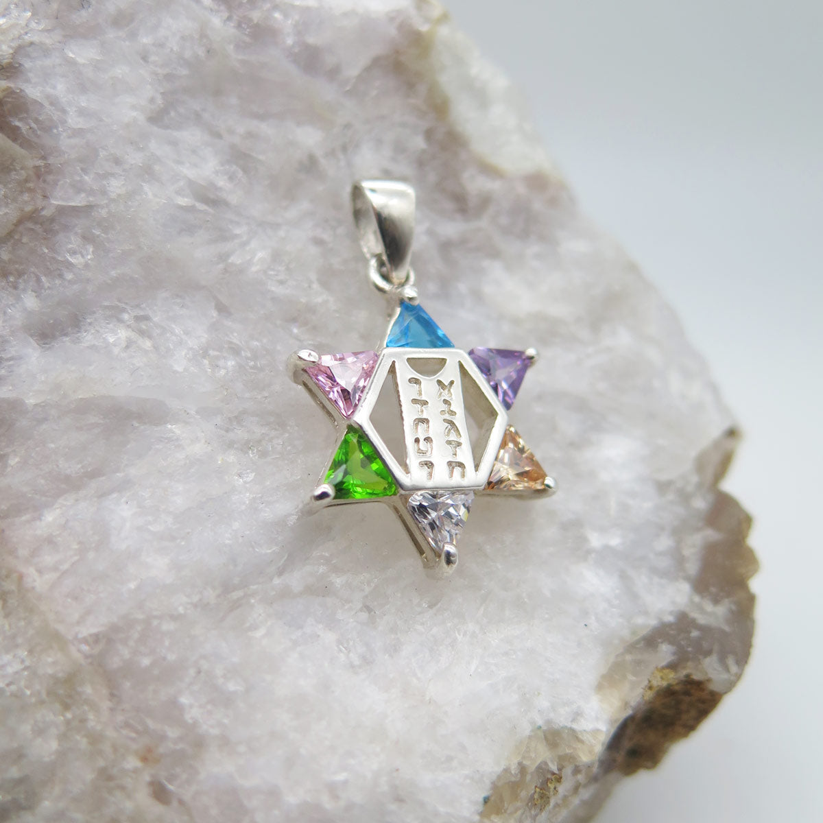 Magnifique pendentif Etoile de David aux branches de Pierres CZ aux multiples couleurs (turquoise, blanc, rose etc...). La monture en Argent Sterling possède en son centre la Table des Dix Commandements.
