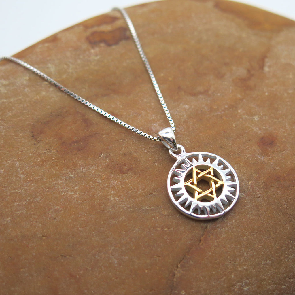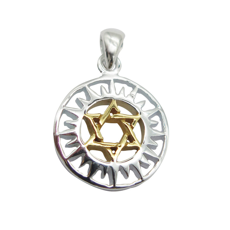 Ce joli pendentif Etoile de David et son Soleil en plaqué or, est délicatement orné d'un soleil en argent finement travaillé.