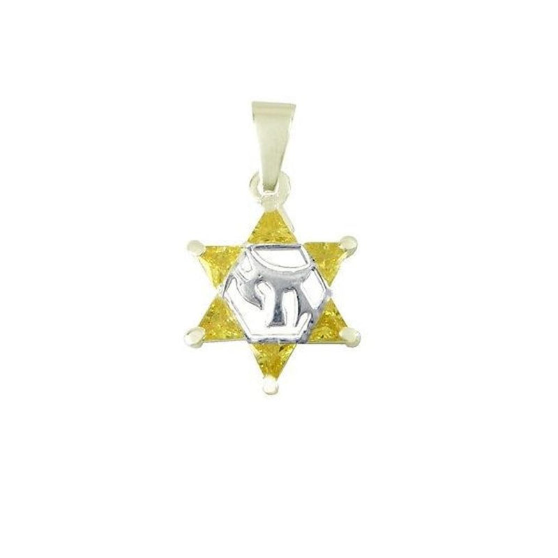 Un pendentif élégant et féminin avec la silhouette d'une Étoile de David et son Haï en Argent. Les cristaux de Pierres Cz contrastent avec le Haï en argent 925 et la couleur citrine, pour créer un look contemporain.