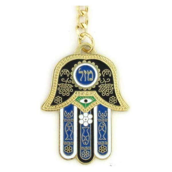 Ce porte-clés représente une Hamsa bleue, contenant divers dessins (poissons, œil, fleurs) et où l'on peut lire l'inscription "MAZAL". Sur l'autre face de celui-ci, il y a la prière de "Tephilat ha derech".