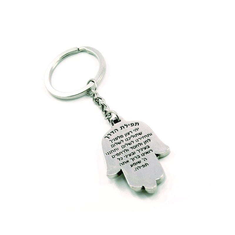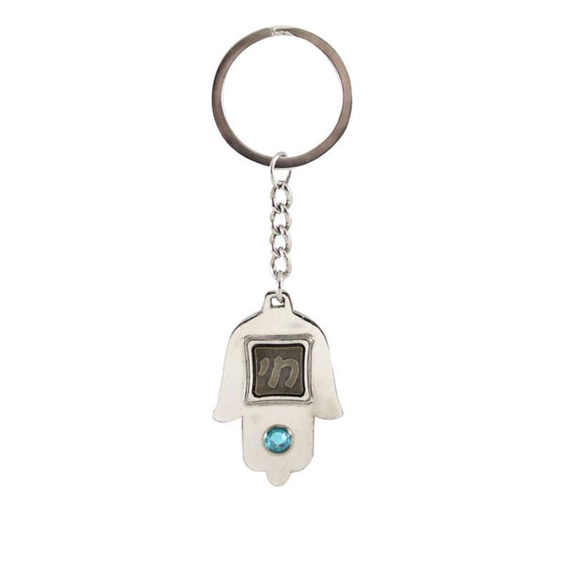Ce porte-clés Hamsa avec l'inscription "Chaï" en lettres hébraïques. Cet objet en métal argent et or vieilli, est orné d'une petite pierre bleue.