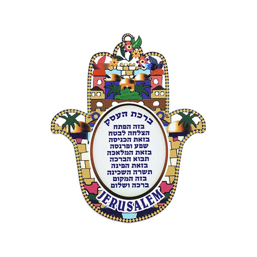 A accrocher sur votre mur, cette Hamsa de Bénédiction pour votre entreprise en Métal vous séduira par ses motifs colorés représentant Jerusalem.