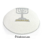C'est une Kippa faite entièrement au crochet et de haute qualité que nous vous proposons. De couleur blanche, arborant une Ménorah d'argent souligné de l'inscription "Jérusalem", elle pourra se porter en toutes occasions.