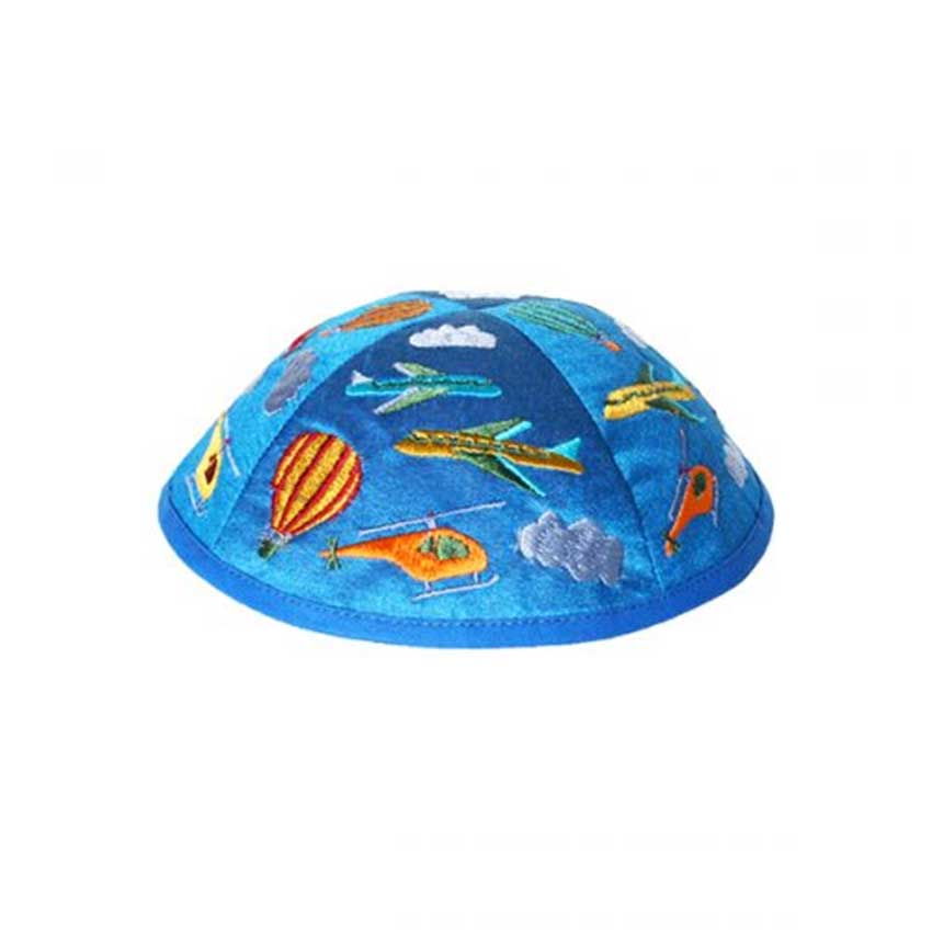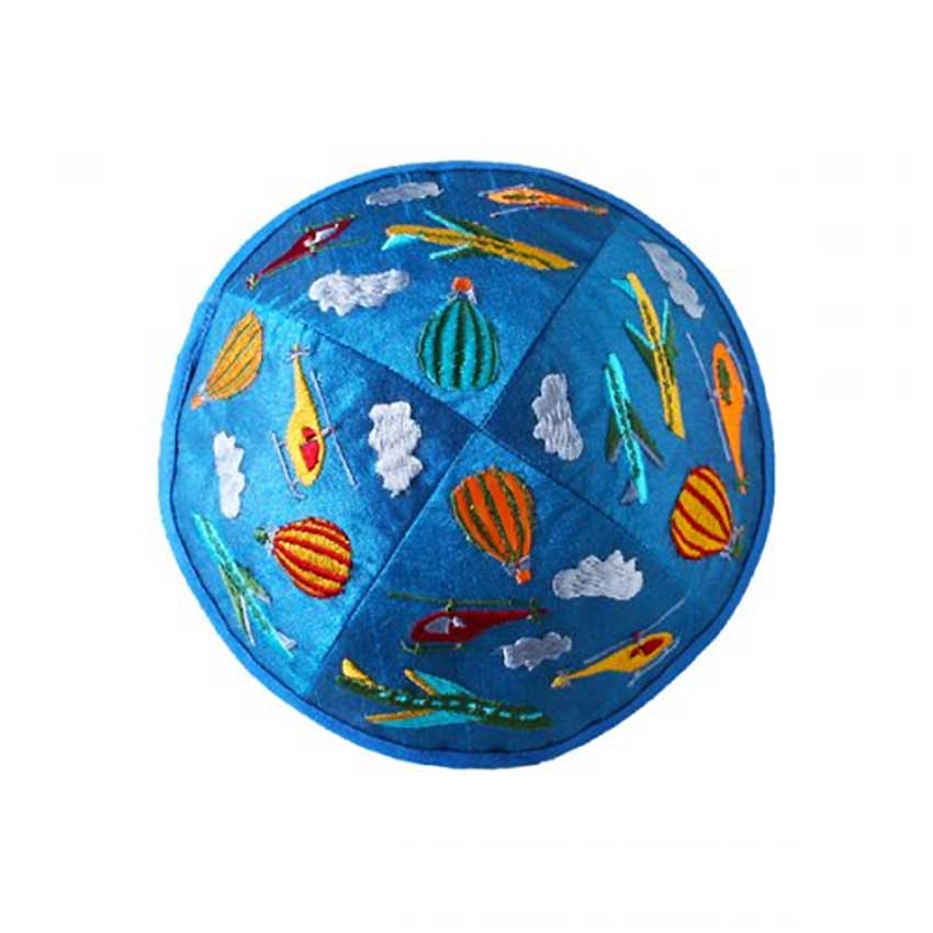 Cette kippa colorée et originale est une belle façon d'apprendre le judaïsme à votre enfant. Elle comporte des broderies représentant des montgolfières, des avions et des Hélicoptères.