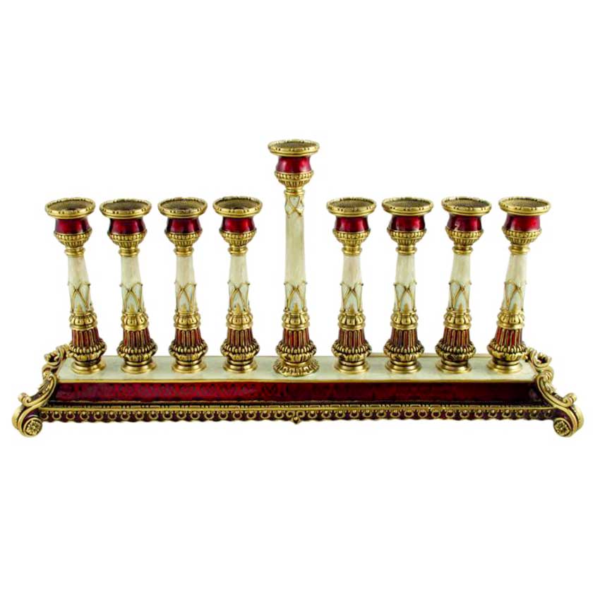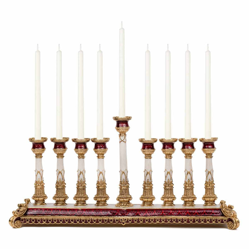Cette superbe Menorah Hanoukia Impériale à l'allure royale ajoutera de la classe à votre cérémonie d'allumage. Faite d'étain et recouverte d'or, elle est fabriqué et peinte à la main dans de magnifique rouge profond, or et ivoire.