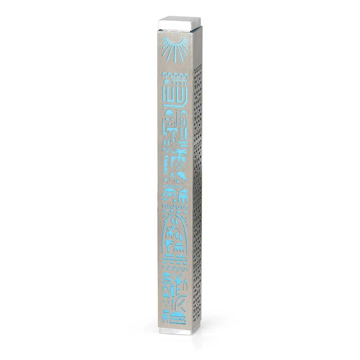 Faite d'aluminium et métal découpé au laser, cette mezouza affiche une représentation complexe de l'ancienne Jérusalem dans un design rappelant les hiéroglyphes égyptiens, sur un fond de couleur Turquoise. Mélange parfait de tradition juive et de design contemporain, ce boitier de mezouza occupera une place de choix à l'entrée de votre maison.