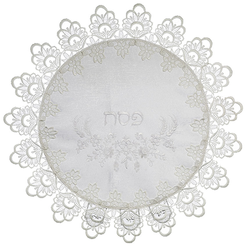 Joli Napperon de Pessah, agrémenté de dentelle tout le long et brodé de petites fleurs.