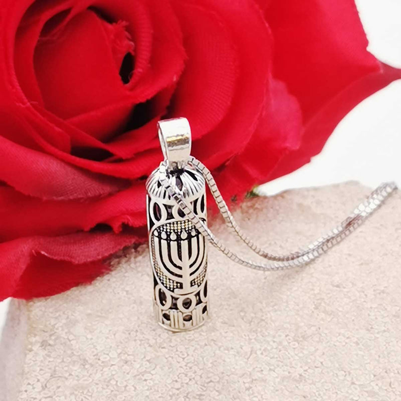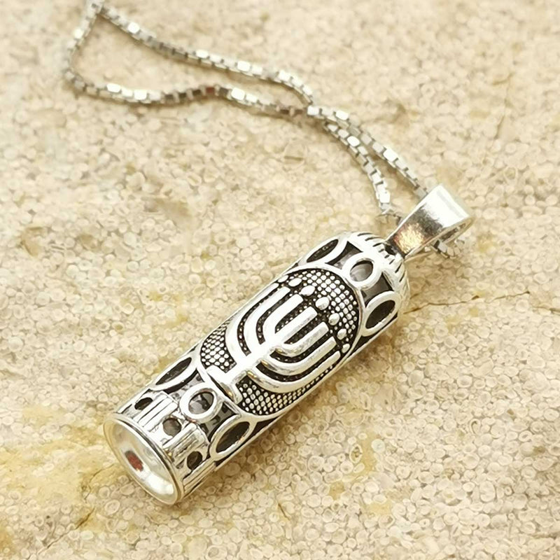 A l'intérieur de ce Pendentif Mezouza d'argent 925 - Menorah, un petit parchemin y est inséré.